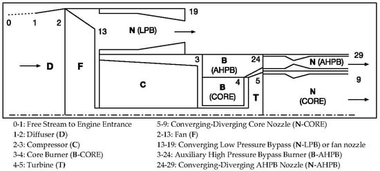 - AHPB stream—For the AHPB stream, station 24 to station 29 was assumed to be a perfectly expanded converging–diverging nozzle, i.e., . Additionally, , as the flow was assumed to be isentropic. The temperature at the nozzle exit, , was computed by substituting i = 29 into Equation (2) and taking . At the AHPB nozzle exit, the Mach number (M29), the speed of sound (a29), and the velocity of air (V29) were also computed similarly to the corresponding values in the core stream. Since a perfectly expanded converging–diverging nozzle was assumed, .