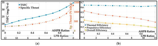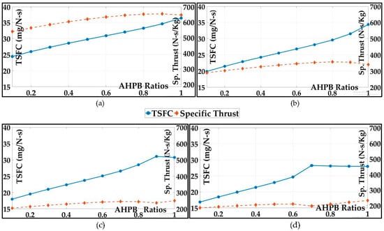 - LPB stream—With the intent of obtaining maximum thrust and maximizing the overall efficiency [1], the fan total pressure ratio, , was varied between 1.78 and 6.10 for the LPB ratio varying from through . Also, . The stagnation value of temperature, , was computed by substituting i = 2, j = 13, and into Equation (6). The stagnation value of specific enthalpy, , was computed by substituting i = 13 into Equation (3). Additionally, and .