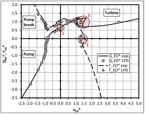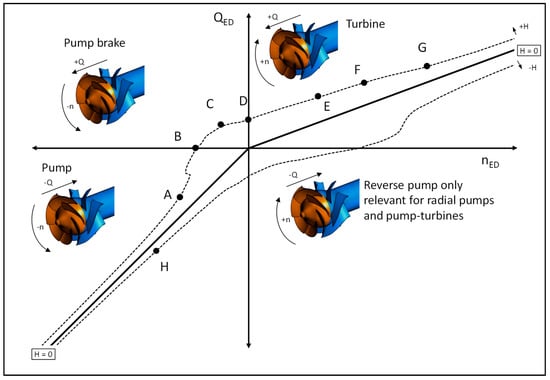 There are several ways to describe the hydraulic behavior of a pump in normal and abnormal conditions. The representation of the 4-quadrant performance of a pump with the head coefficient ψ (Equation (1)) and the flow coefficient φ (Equation (2)) is not preferable since the direction of rotation is not captured. Another disadvantage of this notation appears with blocked impeller, where a singularity in φ and ψ occurs. The IEC 60193 [11] suggests the illustration of the overall pump behavior with the discharge factor QED (Equation (3)), the speed factor nED (Equation (4)) and the torque factor TED (Equation (5)).