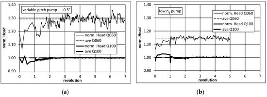 Head history of unsteady simulations: variable pitch at pump −0.5° (a) low nq pump (b).