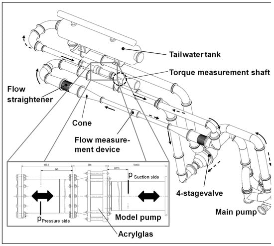 The model pumps were manufactured at the institute’s workshop and installed on the closed loop test rig shown in Figure 7. To account for a hydraulic performance test in all normal and abnormal pump operation modes, a speed-regulated pump drive was used, which can also change the direction of rotation. Additionally, the flow direction at the test rig can be reverted to analyze the machine performance with pump (solid arrows) and turbine (dashed arrows) discharge.
