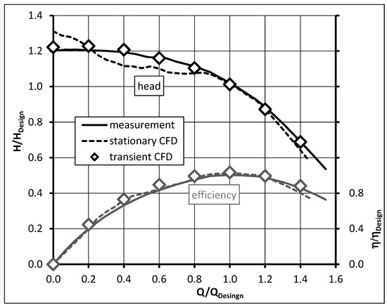 Furthermore, it turned out that the results of the average head, calculated based on transient simulations are slightly higher than compared to the stationary simulation. Thus, the complete head curves originally calculated by means of stationary CFD were shifted by the found deviations. By applying this approach, an increase in accuracy and reliability of the stationary numerical results compared to measurements is obtained as it is shown in Section 4.