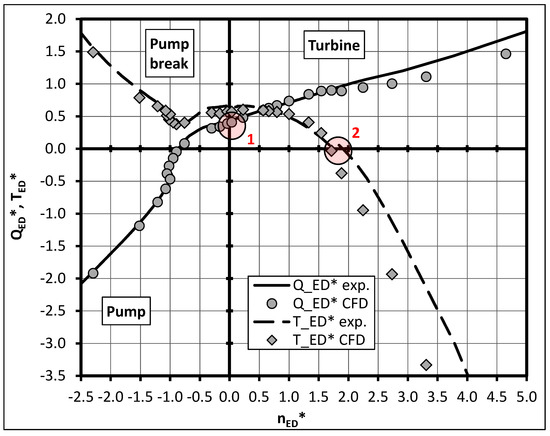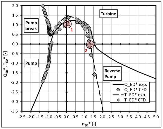 Four-quadrant behavior: numerical (markers) and experimental data (lines); variable pitch pump −9° blade position.