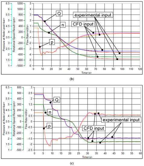 Figure 14 shows the results for a calculated pump trip after 5 s of stationary pump operation of the variable pitch pump with 0° pitch angle (a) and with −9° pitch angle (b) as well as for the low nq pump (c). All diagrams give a comparison of the system transients for flow rate (Q), pump rotational speed (n) and the pressure at the pump outlet (p) obtained with the experimental 4-quadrant curve and with the 4-quadrant behavior resulting from the CFD calculations according to Figure 10, Figure 11 and Figure 12.