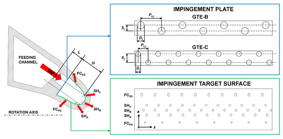 The investigated geometry (Figure 1) replicates a scaled up leading-edge cooling system. A radial feeding channel provides coolant air to an array of square-edged round holes, which generate a series of jets impinging on the inner surface of the LE cavity. In this work, two different impingement geometries have been compared, denoted as GTE-B and GTE-C respectively, whose features are reported in Table 1. GTE-C presents twice the number of impingement holes of GTE-B and a smaller hole diameter, but in order to perform a significant comparison the two geometries have the same overall geometric passage area: this allows investigation of the effects of a different coolant distribution with similar average jet velocities and coolant consumption. The value for the passage area has been defined considering a realistic ratio with the LE section, while the staggered arrangement has been selected since shifting holes towards the LE sides is expected to provide higher heat transfer for a wedge-shaped cavity [7]. For both geometries, hole axis is inclined 35.6° towards the pressure side.