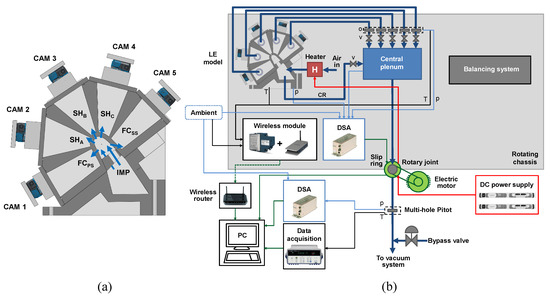 Heat transfer measurements have been performed thanks to a dedicated test rig, a scheme of which is reported in Figure 2. The rig consists of an open loop suction type wind tunnel installed on a rotating chassis. A rotary joint supports the chassis, performs the pneumatic connection and allows data transmission and power supply to the onboard instrumentation thanks to a series of slip rings. Rotation is obtained thanks to a 7.5 kW electric motor, and air circulation is allowed by four vacuum pumps with 2400 m3/h total capacity.