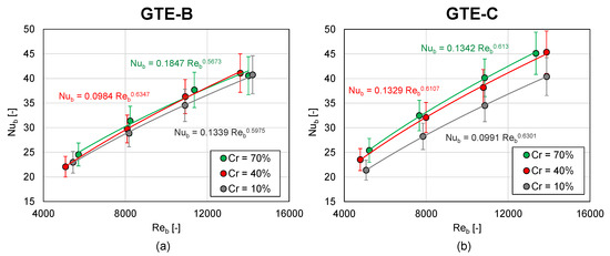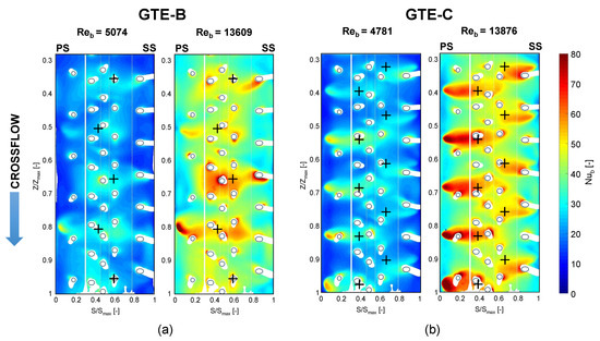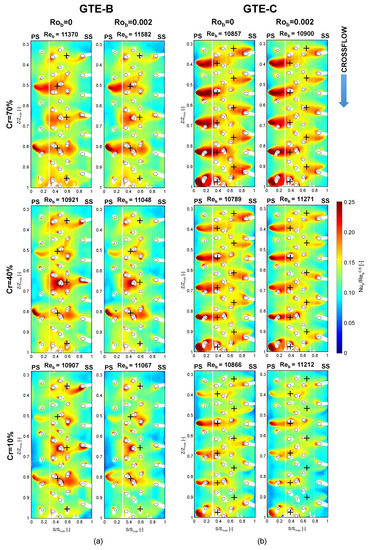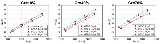 Rotational effects can be quantified by considering area averaged values, which are reported in Figure 6. For both GTE-B and GTE-C it can be observed that heat transfer reduction due to rotation decreases as crossflow increases, changing from an average of around −6% at Cr = 10% to −2% at Cr = 70% in the investigated range. Figure 6 also shows that GTE-B and GTE-C geometries have almost identical heat transfer performance at Cr = 10%, i.e., when the lowest jet lateral spreading is present. As crossflow increases, GTE-C starts providing higher heat transfer than GTE-B in both static and rotating conditions, with an 8% average increase at Cr = 40% and a 10% increase at Cr = 70%. As a consequence, it seems that smaller holes allow a better exploitation of the increased jet lateral spreading in high crossflow conditions, which is likely related to the possibility of distributing the coolant closer to the cavity side walls.