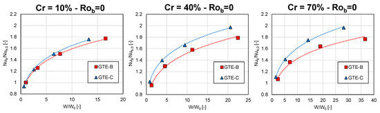 The analysis performed in the previous paragraphs revealed that the highest heat transfer values are generally associated with GTE-C geometry. Even so, in order to determine the actual cooling performance also pressure losses need to be taken into account. In fact, even if the two geometries have the same geometric passage area, the different holes diameter, length, and location may lead to different pressure losses for a given overall mass flow rate. In order to take this phenomenon into account, Figure 7 presents area averaged values as a function of the pumping power , where is the pressure drop across the impingement plate. and W values are scaled with respect to the corresponding values and of GTE-B static test in minimum and conditions. Power law fittings are also reported for each dataset. The charts reveal that in every condition GTE-C is associated with a lower pumping power (i.e., lower pressure losses) and provides equal or higher heat transfer than GTE-B. Similar trends are also observed for rotating tests, not reported for the sake of brevity. As a consequence, it can be stated that the best overall cooling performance in the investigated range of parameters is provided by GTE-C geometry. The superior performance of GTE-C is particularly evident with large values, given the stronger heat transfer enhancement obtained as the jet lateral spreading increases.