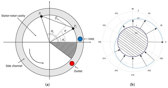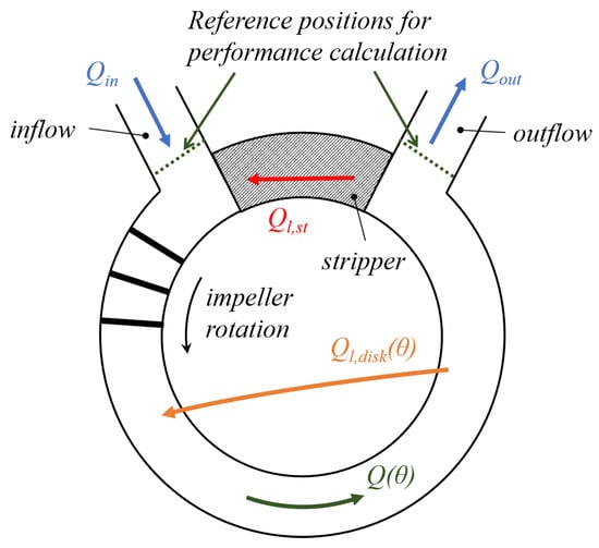 The typical distribution of flow rate obtained from the aforementioned model is schematized in Figure 7b. The leakage flow rate is maximum close to the stripper (maximum pressure drop available) and reaches zero in the circumferential position opposite to the stripper region. In a real machine, a leakage flow rate will also be present between the stripper and the cavity. In the present model, the stripper leakage flow rate is supposed to move across the stripper from the outlet to the inlet of the regenerative machine ( Q l , s t in Figure 1) without any interaction with the cavity flow and then it is treated separately from the disk leakage.