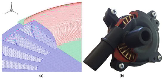 The computational grid used for the three-dimensional RANS simulations of the pump is generated with the meshing tool of the commercial software Pumplinx ® . Attention is dedicated to the refinement of the critical region of the stripper leakage and of the cavity. The overall grid is composed by about 14.8 M elements. Such grid resolution is appropriate to make the problem grid-independent according to the authors of [,], who performed grid sensitivity studies on similar machines. A detail of the grid is reported in Figure 2a, where the surface meshes of the impeller (in blue), of the side channel (in red) and of the stationary wall (in green) are visible.