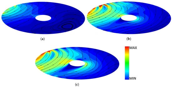 For what concerns the pressure maps in Figure 4, it can be underlined that increasing the axial gap (and then the leakage flow rate) the maximum available pressure value in the side channel decreases and then the performance of the regenerative pump reduces. In Figure 4a, it is possible to observe how the pressure value decreases from the outlet zone to the inlet zone in a linear way inside of the cavity. Despite the decrease of the pressure rise, a similar behavior can be observed in Figure 4b. On the contrary, for the higher aspect ratio of the cavity (Figure 4c), the pressure rise decreases so much that, using the same color scale as in Figure 4a,b, the cavity seems to be almost isobaric. That outcome underlines how leakage flows govern the performance of regenerative pumps.