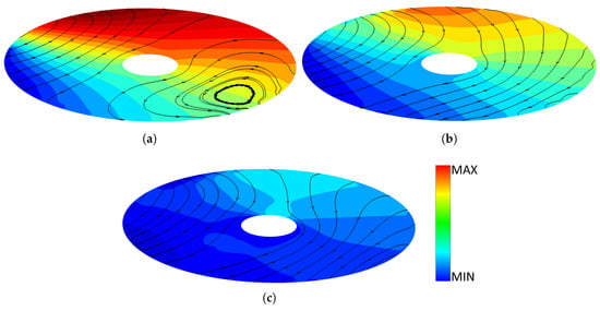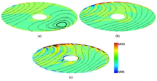 In Figure 5, the velocity map along the z-direction (the direction parallel to the axis of the shaft) is reported. It can be observed that that velocity component is close to zero in almost the entire cavity. Considering the higher axial gap (Figure 5c), the zones where the axial velocity is not negligible are close to the high pressure zone, where the circulatory flow pattern in the side channel is dragged into the cavity, and near the shaft, where the wake behind the shaft increases the vorticity and establishes vortices that result in components of velocity along the z-direction. It can be concluded that the flow is almost planar in the cavity for most of the geometrical configurations. Therefore, the hypothesis of planar flow is acceptable in the development of the leakage flows model in regenerative pumps.