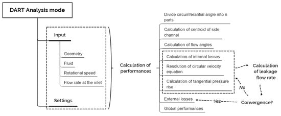 The use of simplified models for the preliminary analysis and design of energy systems’ components is widely accepted in the turbomachinery field (see, for example, [,,,]). Concerning regenerative pumps, a one-dimensional tool called DART (Design and Analysis tool for Regenerative Turbomachinery) has been developed aiming at providing preliminary design parameters for the setup of detailed three-dimensional numerical simulations. A general scheme of the DART solver is reported in Figure 6. For the development and verification of the original version of the DART code, refer to the work in []. A brief description of the solver follows.