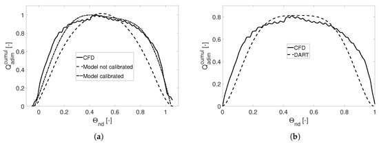 Figure 8. Q c u m u l comparisons for h / H = 0 . 00886 : (a) model and CFD data; and (b) DART and CFD data.