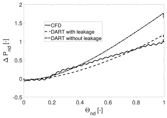 A comparison between the performance obtained with DART and with the CFD campaign introduced in Section 2.1 is here reported. In Table 2, the data obtained from DART with the leakage option switched on and off are compared with CFD data. Variables were reduced to non-dimensional values with reference to the non-dimensional Δ p value obtained using CFD for the case with a non-dimensional axial clearance equal to 0 . 0177 .