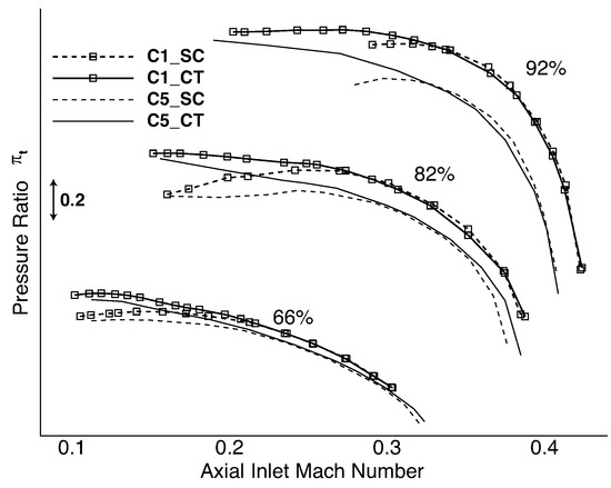 Figure 11 gives a complete overview of the positive CT effects on a compressor map. The CT reduces blockage and therefore losses due to recirculation at the blade tip. For high and nominal Mach number operating points, the deviation in efficiency between SC and CT is within measurement accuracy and cannot be quantified. This is coherent with the analytical approach, because recirculation only develops near stall, at low inlet Mach numbers. It underlines that the CT is only active if a recirculation is formed in the inducer. Losses corresponding to the CT are consisting mainly of friction losses in the CT at the wall and mixing losses when injecting fluid with high velocity into the main stream. When the CT is inactive, these losses are reduced to a value below measurement accuracy even for high rotational speed.