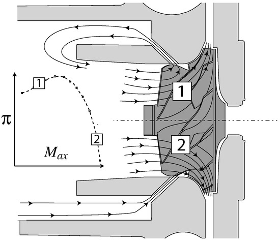 For low throttling operating points and high rotational speeds, i.e., when the impeller is choked, static pressure at the inducer shroud is lower than at the inlet of the compressor. This effect is due to flow acceleration from the inducer to the smallest aerodynamic cross section in the impeller. At operating points close to choke, this results in an increase of dynamic pressure while simultaneously decreasing the static pressure. According to Japikse [8], the inducer can be modeled with a two elements in series (TEIS) model. The model assumes an impeller passage to consist of two succeeding elements. The first element, the inlet portion of the blade channel, may have either nozzle or diffuser characteristics, depending on the incoming flow rate. The second element, the portion between throat and exit, is most often a diffuser independent of the flow rate. The static pressure difference at the shroud induces airflow. Air is sucked into the bypass in front of the impeller and injected to the rotor shroud. This can increase the choke mass flow rate. Both effects increase the operating range for low as well as for high mass flow rates.