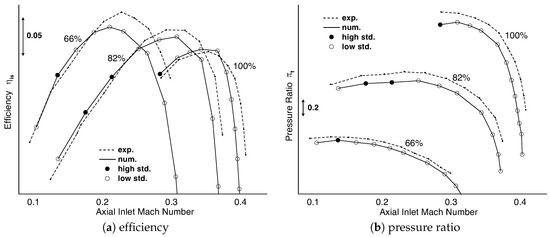 Convergence was monitored online. Besides residual monitoring (threshold is ), the results of 30 iterations were averaged and a standard deviation was computed. If the standard deviations of pressure ratio and efficiency fell below and mass fluctuates by less than [kg/s], the simulation was stopped immediately and treated as fully converged. Otherwise, a simulation was stopped after 200 iterations, because no convergence progress was expected. In those cases, flow instabilities led to fluctuations during the iteration process. Therefore, simulation results were averaged over several fluctuation periods during iteration process and only averaged solutions were evaluated. Those points had a standard deviation between and . To highlight these averaged results, they are marked in the corresponding figures.