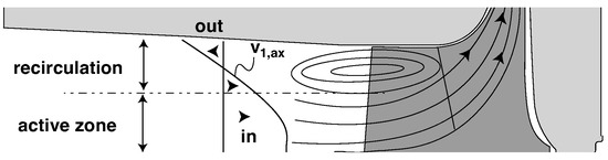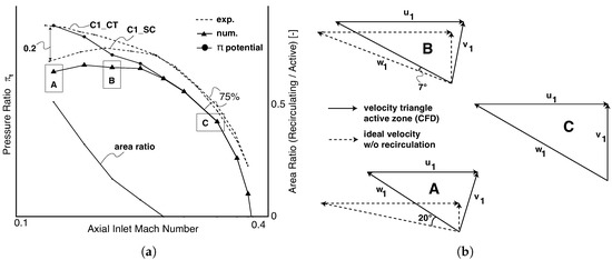 The Euler equation (Equation (2)) can be used to estimate the impact of the changed velocity triangle. The triangle of the active flow zone was evaluated from numerical results while, for reference, an ideal triangle was calculated with the assumption of no recirculation (cf. Figure 10b).