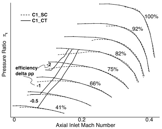 Compressor map comparison of CT impacts on pressure ratio and efficiency with experimental results of C1 impeller.