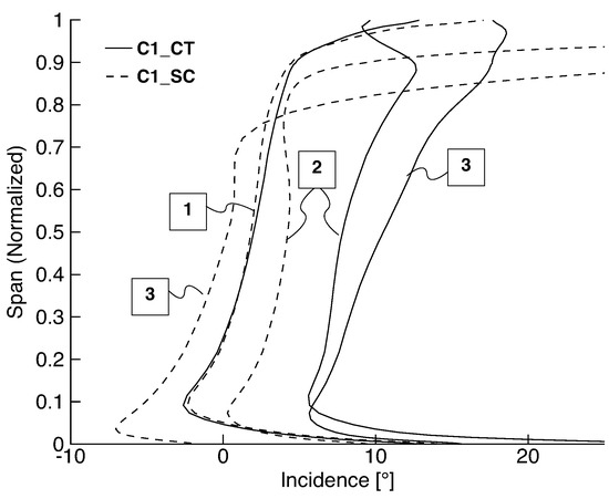 Operating Point 1 shows no recirculation and the CT is inactive, the incidence angle of SC and CT are equivalent. When the compressor is further throttled, the recirculation zone starts to form and massively increases incidence in this region. The CT actively influences the flow and reduces incidence. Therewith, the incidence over the whole span is affected. Absolute velocity is decreased while meanline radius is increased. The difference in incidence angle between CT and SC for Operating Point 2 at mid span equates approximately to the calculated analytical potential of Operating Point B in Figure 10a,b (cf. Figure 6). This effect increases towards the further throttled Operating Point 3. The results with smooth casing indicate that the incidence angle at hub and mid span is reduced for Operating Point 3. This is due to the massive redistribution of mass to lower span radii. The application of the CT in contrast increases the incidence in this region. These observations are consistent to the analytically calculated work potential. The CT reduces blockage and recirculation in the tip region of the inducer and thereby decreases incidence in this region. This not only enables a high work input coefficient at the shroud, but also increases the incidence angle at the blade hub. The difference in pressure ratio with the CT is almost equal to the analytically calculated one in Figure 10a. The unsteady CFD result in Figure 12 further confirms that the CT is able to minimize the recirculation zone in the inducer.