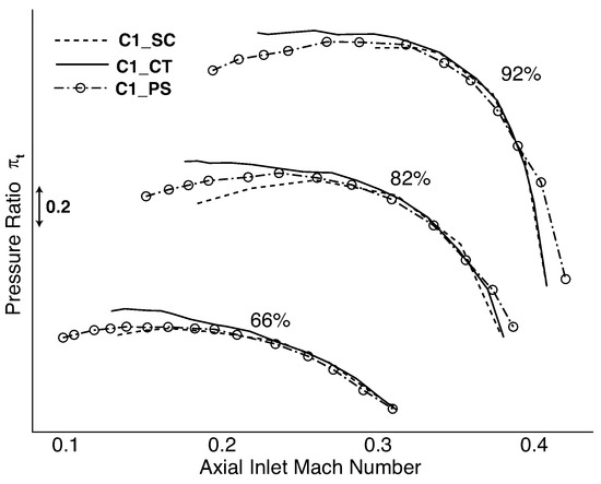 Experimental comparison of C1 compressor performance with smooth casing (SC), inducer bypass (PS) and casing treatment (CT).