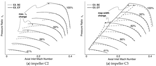 In Figure 15a,b, a comprehensive overview of pressure ratio and map width change due to the application of the CT is visualized. The definition of pressure ratio and map width change is depicted in Figure 14a,b. An increase in range in comparison to SC has a positive sign and a decrease negative. While pressure ratio can be increased for all investigated impellers throughout the complete compressor map, the application of the CT reduces map width in the middle of the compressor map for C2, C3 and C4 (cf. Figure 14b). In the case of high rotational speed and a corresponding high pressure ratio, the stable operating range is increased and compressors benefit from the application of the CT. The pressure ratio is only enhanced slightly in this region. Performance variations might be explained by the design differences, but these detailed considerations are out of scope of this paper.
