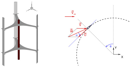 This study focuses on a model turbine representative of a real-scale VAWT for micro-generation ( = 200 W). The rotor features a straight H-shape and consists of three unstaggered blades; see Figure 1 which displays the turbine configuration along with the coordinate system and the relevant angles. The main geometrical characteristics of the turbine considered are reported in Table 1. Full details on the turbine geometrical features, as well as on the turbine operating and performance parameters, can be found in [14].