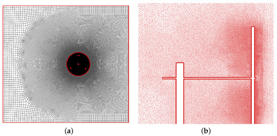 In the early stages of this work, a grid convergence study was performed related to both the near-wall region and the global resolution level, documented in [17]. The study was performed for the 2D mesh on the equatorial plane at TSR = 3.3. In all the tested meshes, as the selected turbulence model allows solving entirely the flow in the boundary layer, the near-wall space discretization fulfills the requirements of and of a smooth growth across the boundary layer. On the basis of these considerations, a base grid was then constructed and is shown in Figure 2a. It consists of 253.800 cells (40.000 out of them are in the outer region), with a minimum distance from solid walls of mm and a local growing factor of the boundary layer of 1.2. To assess the influence of global mesh density, tests were run with two finer meshes featuring, alternatively, the double number of elements and half the cell size at the walls. Both these tests did not show any significant difference with respect to the base grid, which was therefore considered suitable for obtaining a grid-independent solution (see Table 3 of [17]).