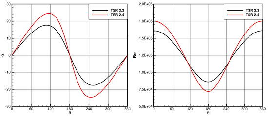 The analysis of the VAWT flow field first focuses on the rotor aerodynamics. To give an idea of the local conditions experienced by the blade during the revolution, Figure 3 shows the angle of attack and the Reynolds number (based on chord and relative velocity) profile for both TSRs studied. Note that these graphs of course neglect any induction effect, i.e., the local wind absolute velocity is the freestream one.