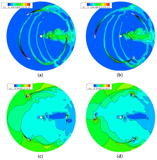 As well known, during a revolution the VAWT blades experience a cyclic variation of angle of attack and of relative Reynolds number, which induces a periodic fluctuation of blade forces. Such effects grow progressively as the TSR reduces; however, they appear even at TSR = 3.3, as shown by Figure 4, which reports instantaneous snapshots of the turbulence and velocity fields in the equatorial section of the turbine, for two rotor positions.