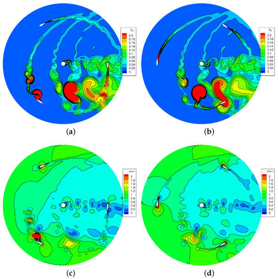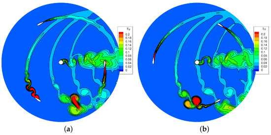 As a too severe separation is responsible for the mismatch with the experiment, a potential modeling issue was identified in the low-Reynolds formulation of the turbulence model. Simulations were then performed without such feature, and the corresponding turbulence field is reported in Figure 8. The new simulation still predicts the onset of dynamic stall at the end of the upwind phase which corresponds to a period of passive torque, but the extension of the separated region and the scale of the vortices detached by the blades are much smaller with respect to those predicted with the low-Reynolds model, shown in Figure 6. Correspondingly, Figure 7 reveals that the peak of passive torque is strongly mitigated. Differences arise also for , as the much “cleaner” flow configuration predicted without the low-Reynolds correction induces a higher (active) torque. Very similar flow field and blade aerodynamics are predicted by the two simulations for , where the lower angle of attack does not activate any relevant dynamic stall effect.