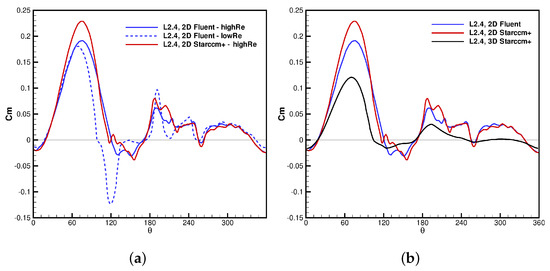 TSR = 2.4: profiles of torque coefficient as a function of . (a) 2D simulations. (b) 2D-3D simulation.