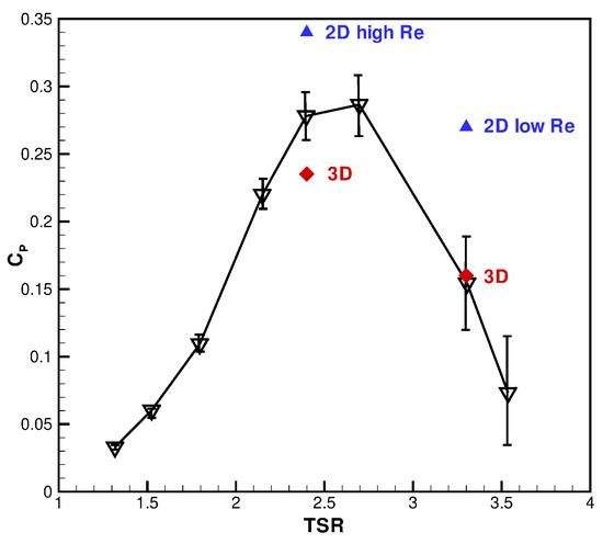 In Figure 9 the turbine Cp values measured for all the operating TSR conditions are displayed along with the computed 2D and 3D results obtained using Star-CCM+. In Table 3 the computed Cp values are also reported together with those obtained with ANSYS-Fluent. These results allows to appreciate the difference between 2D predictions obtained using the model with or without the low-Reynolds correction. There is a discrepancy between the 2D Fluent and the Star-CCM+ results, due to different underlying numerics (unknown to the user), but this difference is still within a reasonable tolerance level, comparable to the uncertainty of the experimental datum and considerably smaller (even one order of magnitude lower for the TSR = 2.4) than that obtained by activating the low-Reynolds correction.
