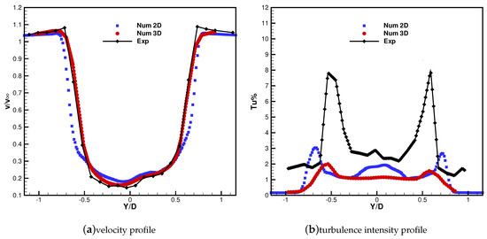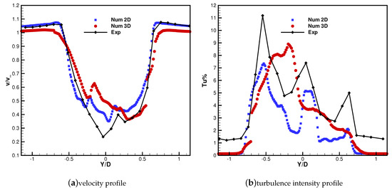 The time-averaged wake profiles on the equatorial section are first considered and are shown in Figure 10 and Figure 11 against the experimental data. The velocity profiles are found to be in very good agreement with the experiment in terms of wake width and shape. The velocity deficit, perfectly captured by the simulation for the high TSR condition, is slightly underestimated for TSR = 2.4. The profile of turbulent intensity () predicted by the 2D simulation, computed as , is also compared with the experimental result. For TSR = 3.3 the trend is reproduced in acceptable manner even though the turbulence level are not captured. A similar behaviour is also observed for the 2D results obtained for TSR = 2.4. For such condition, three peaks of turbulence intensity are observed, connected to the two shear layers at the sides of the wake and to the viscous wake of the pole. This trend is well captured by the simulation, with an underestimation consistent with the fact that in the experiments is defined using only the of the velocity fluctuation in the freestream direction, i.e., the greatest term, whilst in the simulations velocity fluctations are assumed isotropic. Moreover, in the experiment every unsteadiness at locked rotor angular position is considered to be turbulence. Instead, as indicated by the smeared profiles obtained in 3D (see Figure 7 and Figure 11), the flow gradients appear somewhat damped due to insufficient mesh resolution. As a matter of fact, the adopted grid density, slightly reduced with respect to the 2D cases, is deemed necessary to limit the computational cost at a reasonable level; however, as shown by the present results, such discretization allows obtaining reliable predictions of the turbine performance and of the wake velocity profile.