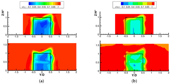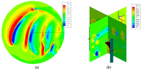The three-dimensional character of the wake is illustrated in Figure 12 that shows the time-mean velocity contours on a surface normal to the streamwise direction at . The shape of the wake has an evident asymmetry with respect to the shaft especially in the top quarter of span, closer to the blade tip. In fact, the asymmetry characterizes the VAWT, and the differences between the two sides of the wake result from the different flow processes occurring in the windward (on the right in the frames) and in the leeward (on the left in the frames) fractions of the revolution. As widely discussed in [22], the larger extension of the right side of the wake at the tip is due to the larger mean lift established on the blades during the windward motion, which leads to a stronger tip vortex and relevant losses. This effect grows in importance as TSR reduces, since for lower TSR the differences in blade aerodynamics between the windward and leeward motion become larger. As a result, the tip region of the wake takes an inclined shape that becomes progressively more marked during the streamwise wake development (not reported here for the sake of brevity).