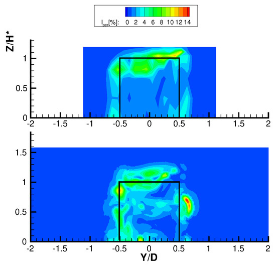 The inherent unsteadiness of VAWT operating principle has an implication on the wake, which undergoes both turbulence unsteadiness and a deterministic periodic unsteadiness locked on the blade revolution. To highlight the different unsteady contributions, in [16] a triple decomposition was introduced for VAWT wakes, which leads to the calculation of an intensity of periodic unsteadiness (). Figure 13 reports the distributions of periodic unsteadiness for TSR = 2.4, which is the more interesting configuration since very low periodic unsteadiness features the wake for TSR = 3.3. First focusing on , the wake exhibits the largest unsteadiness on the leeward (left) side, where the dynamic stall occurs (as seen in the computed flow field on the equatorial plane of Figure 6) and large-scale vortices are periodically shed in the wake flow. High periodic unsteadiness is also found at the tip, where the trailing vorticity undergoes periodic unsteadiness due to the blade motion. The simulation confirms all the observations made on the experimental configuration, even though it indicates a large periodic unsteadiness corresponding to the struts, not captured by the experiments due to the absence of a proper experimental resolution in this area. Examining the distribution of unresolved unsteadiness, the simulations confirm the highest turbulence intensity on the leeward side of the wake, even if the overall intensity is everywhere smaller, owing to the already discussed reasons.