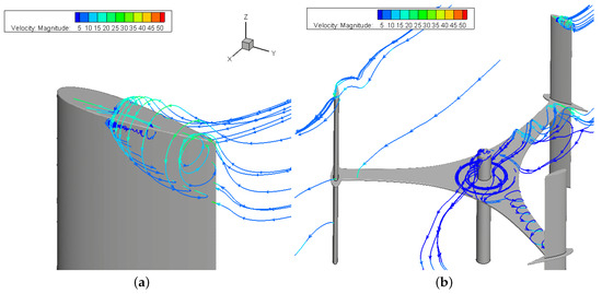 Evidence of the fully unsteady and three-dimensional character of the flow around the VAWT is given in Figure 14, where the complex tip and strut aerodynamics are shown. Notice the whirling flow near the struts and at the top of the shaft that contributes to reduce the extracted power, according to the velocity deficit previously described, due to interaction between the freestream flow and solid walls. Frame (b) of the same Figure shows another relevant feature of VAWTs, i.e., the dependence of the tip vortex on the local position of the blade during the rotation. The streamlines close to the two blade tips visible in Figure 14b show very different flow phenomena; in particular, a wide roll-up of streamlines occurs on the blade placed in the upwind part of the revolution (the one on the top-right part of the frame), similar to the one shown in frame (a). This is consistent with the blade position, as in the upwind part of the revolution both the high flow velocity and the high angle of attack contribute to generate high aerodynamic loading; this induces high work extraction but also high loading, and hence high trailing vorticity. Conversely, the blade operating in-between the leeward and downwind phases of the revolution (the one on the left side of Figure 14b) operates with a lower flow velocity (because of the work extraction in the upwind phase) and with a very high angle of attack, which exceeds the stall limit. As a result, the blade aerodynamic loading established on the blade is relatively low and, hence, the tip vortex is also much weaker with respect to the one in the upwind phase of the revolution. The variation of the tip vortex during the rotation results in a time-periodic evolution of the flow velocity downstream of the turbine in the tip region, thus providing a physical explanation of high observed in both experiments and simulations at the tip border of the wake.