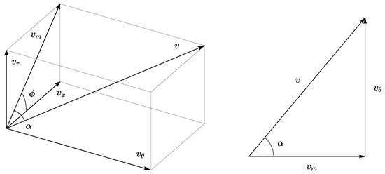 In this work, the velocity is denoted by the symbol v, and the components are denoted by the subscripts —tangential, m—meridional, x—axial, and r—radial. The velocity vector is illustrated in Figure 2 and the different components are given by Equations (6)–(9). The angle is measured from the meridional towards the tangential direction.