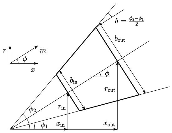 In general, the meridional direction m will not be exactly aligned with the axial x or the radial r directions. This is illustrated in Figure 1b, where an axial–radial view of the diffuser is presented. The mean line of the diffuser can be parametrized as and such that the meridional, radial, and axial directions are related by the angle given by Equation (3).