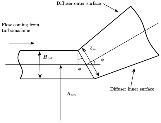 To describe the geometry of the diffuser, the mean radius and the channel height at the inlet are obtained from the turbomachine outlet radius and blade height as given by Equations (28) and (29), see Figure 5.