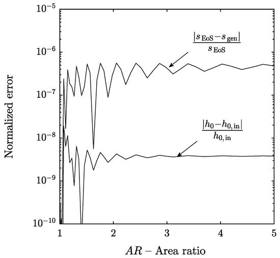 In the absence of heat transfer, the stagnation enthalpy of the flow remains constant, see the Appendix A, and any change in stagnation enthalpy is due to numerical error. The relative stagnation enthalpy error was evaluated using Equations (30) and (31) and it is shown as a function of the diffuser area ratio in Figure 6. It can be seen that the stagnation enthalpy is properly conserved and the relative error is of the order of 10, which is smaller than the prescribed relative tolerance of 10 for the integration of the ODE system.