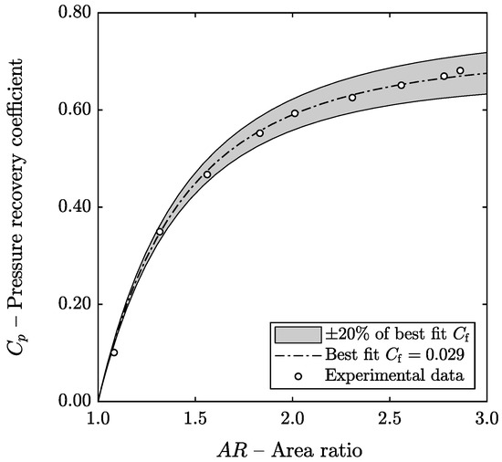 Ignoring the point corresponding to , it can be observed that the relative deviation of the pressure recovery coefficient is always less than 2% when the best-fit skin friction coefficient () is used. It is plausible that the deviation between experiment and model when is due to the development of the flow at the inlet of the diffuser. This analysis shows that the model can be used to make accurate predictions when skin friction coefficient can be fitted to experimental data or approximate predictions in cases where there is no experimental data available.
