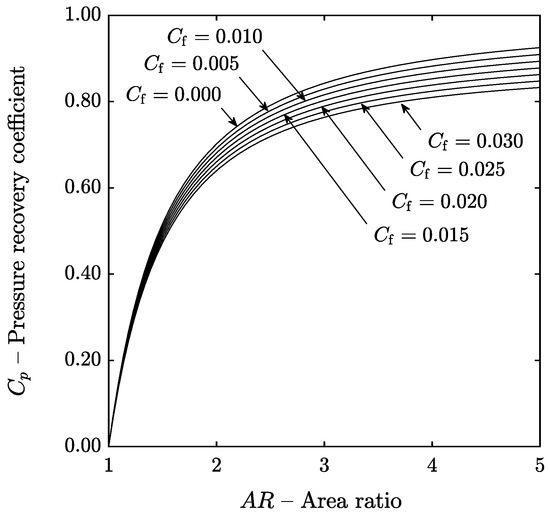 It can be observed that increasing the friction factor decreases the pressure recovery in a linear way (the different curves are equispaced) and that the effect is more notable when the area ratio increases (since the length of the channel increases). For the reference case considered, the pressure recovery increases with the area ratio in a monotonous manner and has an asymptotic behavior, irrespective of the numerical value of the friction coefficient. This suggest that an optimum value of the area ratio that maximizes the pressure recovery does not exist and that the pressure recovery always increases with the area ratio up to a limiting value.