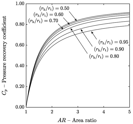 To accommodate the density change, the hub-to-tip ratio is usually high at the outlet of axial compressors and low at the outlet of axial turbines. In this section, the hub-to-tip ratio at the inlet of the diffuser was varied between 0.50 and 0.95 and the results were plotted in Figure 9. It can be observed that the diffuser performance is penalized as the hub-to-tip ratio increases and that the effect is not linear: the pressure recovery coefficient is reduced more rapidly at high hub-to-tip ratios.