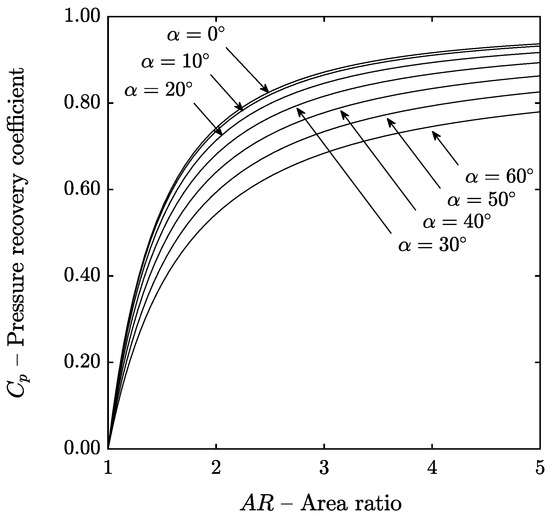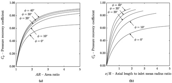 The same results are plotted as a function of the normalized axial length (instead of the area ratio) in Figure 10b. The end of the lines corresponds to the point where . It can be observed that for a fixed diffuser axial length, the pressure recovery coefficient increases as the mean wall cant angle increases because both the area and the mean radius of the channel increase.