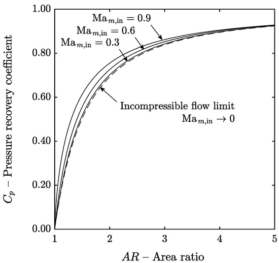 The influence of the inlet Mach number (compressibility effects) on the diffuser performance, including the limiting case of incompressible flow, is shown in Figure 12. The analysis presented on this section was performed assuming frictionless flow instead of in order to compare the results at different inlet Mach numbers with the analytical results for inviscid, incompressible flow given by Equation (36). This equation is a well-known result [1,22] that can be proved integrating the mass and momentum equations, Equations (10)–(12), for constant density and zero wall shear stress.