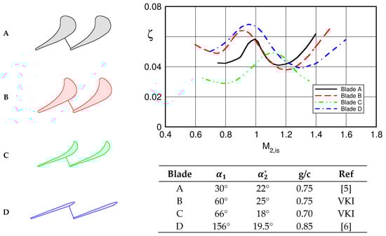 Blade profile losses versus isentropic outlet Mach number for four transonic turbines. Blade A data from [5], blade B and C unpublished data from VKI, blade D data from [6].