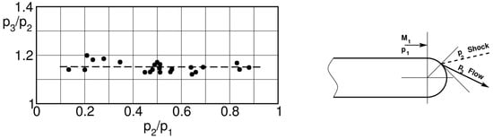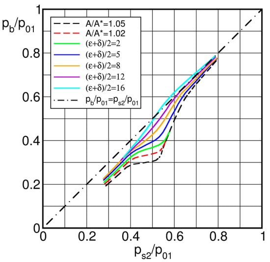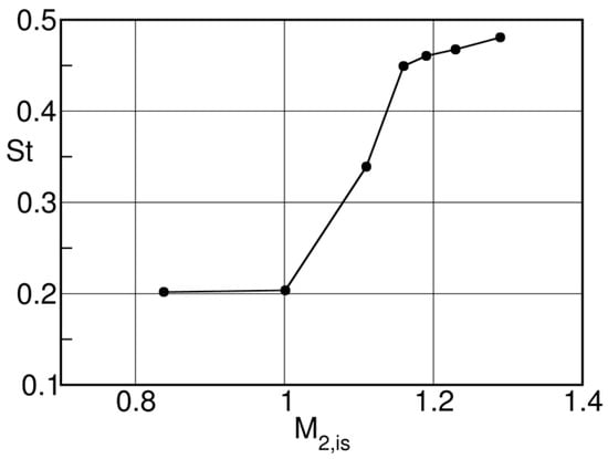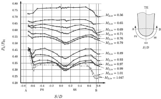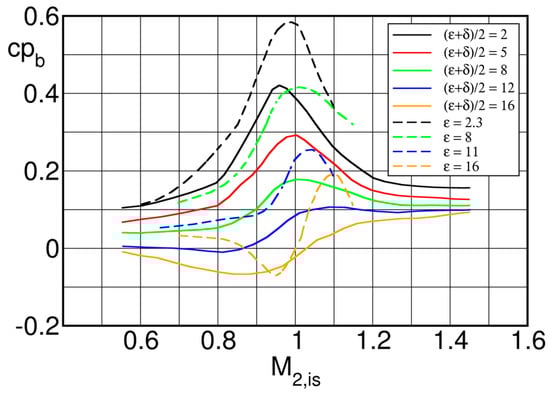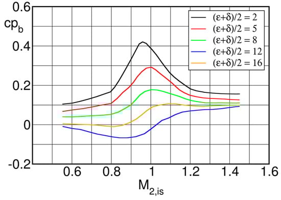 For calculating the trailing edge losses induced by the difference between the base pressure and the downstream pressure, Fabry & Sieverding [8], presented the data for the convergent blades in Figure 2 in terms of the base pressure coefficient , defined by Equation (2), see Figure 5.