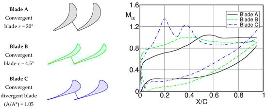 Surface isentropic Mach number distribution for two convergent and one convergent/divergent blades at , based on data from [3].